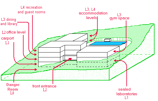 The lower two floors, the offices (level 2) and car park/lab level (level 1), do not have wood paneling on the walls, but have merely painted plaster covering the walls. Once again, the floors in general access areas are tiled, except in individual offices and rooms. The Danger Room (levels 0 and 1) is 30m wide by 30m long, and completely underground. It is two stories high, with access being through the Danger Room control room (level 1), reached via the labs. There is also a hidden emergency exit from the Danger Room control room to the left of the building.
